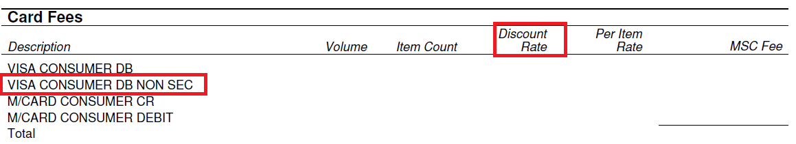 Vanligvis deler kortnettverk transaksjoner fordelt på regioner (for eksempel innen EØS eller interregionalt – USA-utstedt kort i EØS-virksomhet), korttyper (for eksempel VISA debet, Mastercard kommersiell) og transaksjonstyper (chip og pin, E-handel, osv.). Elavon behandler deretter disse transaksjonene som sikre eller ikke-sikre. Alle transaksjoner som behandles som ikke-sikre vil medføre høyere behandlingsgebyr. Alle transaksjoner må også sendes til behandling innen de foreskrevne tidslinjene (3 dager) for å sikre at kvalifisering som sikker blir vurdert*. *en transaksjon som ikke er innlevert for behandling / som ikke batches via dagsavslutningsprosessen innenfor de foreskrevne tidslinjene, kvalifiseres automatisk til ikke-sikker sats. Hvordan transaksjoner behandles og belastes, er tydelig angitt i faktureringserklæringen for forhandler i delen om kortgebyrer, hver transaksjonstype kan identifiseres under beskrivelsen, se nedenfor, VISA forbruker debet ikke-sikker transaksjon – forhandlerens serviceavgift (FSA) vises under delen diskonteringsrenteseksjon. |